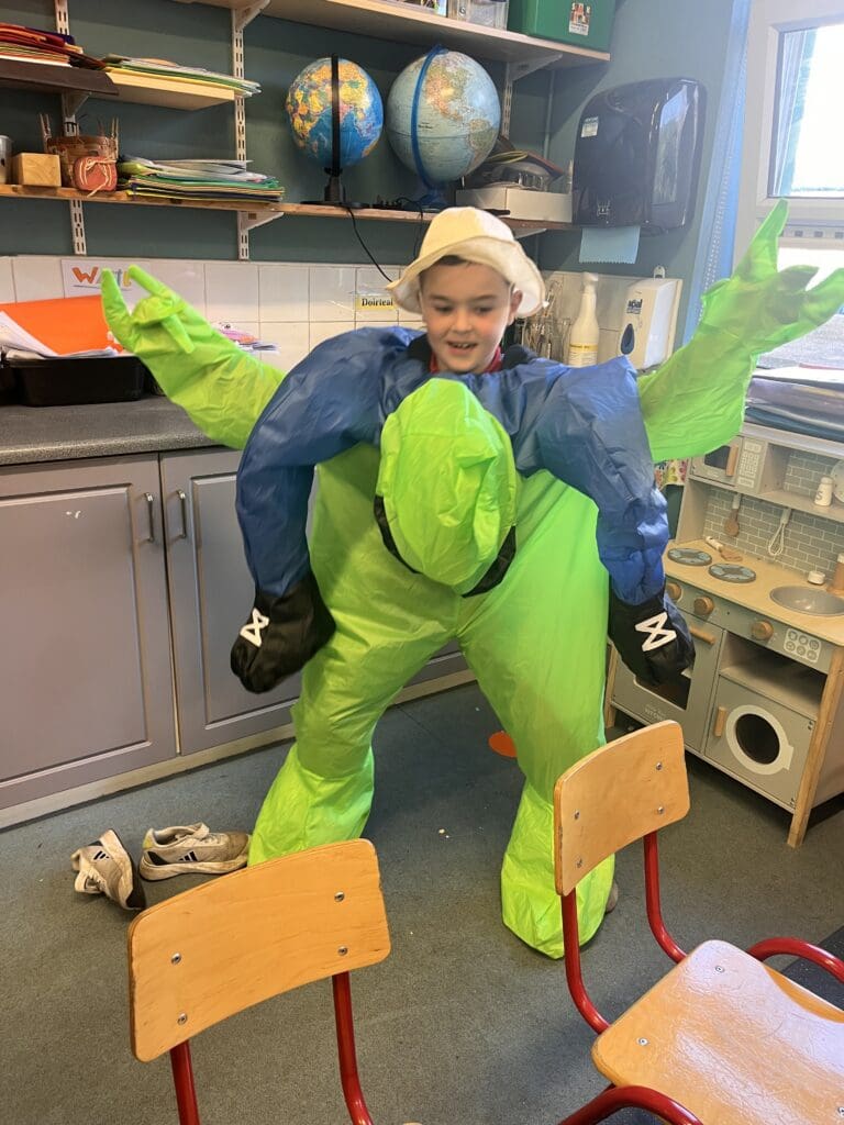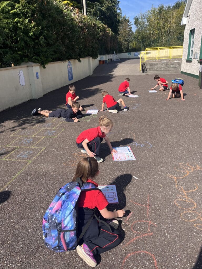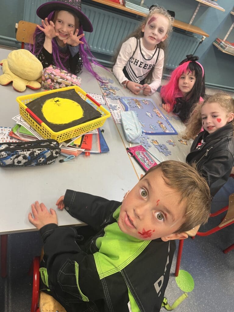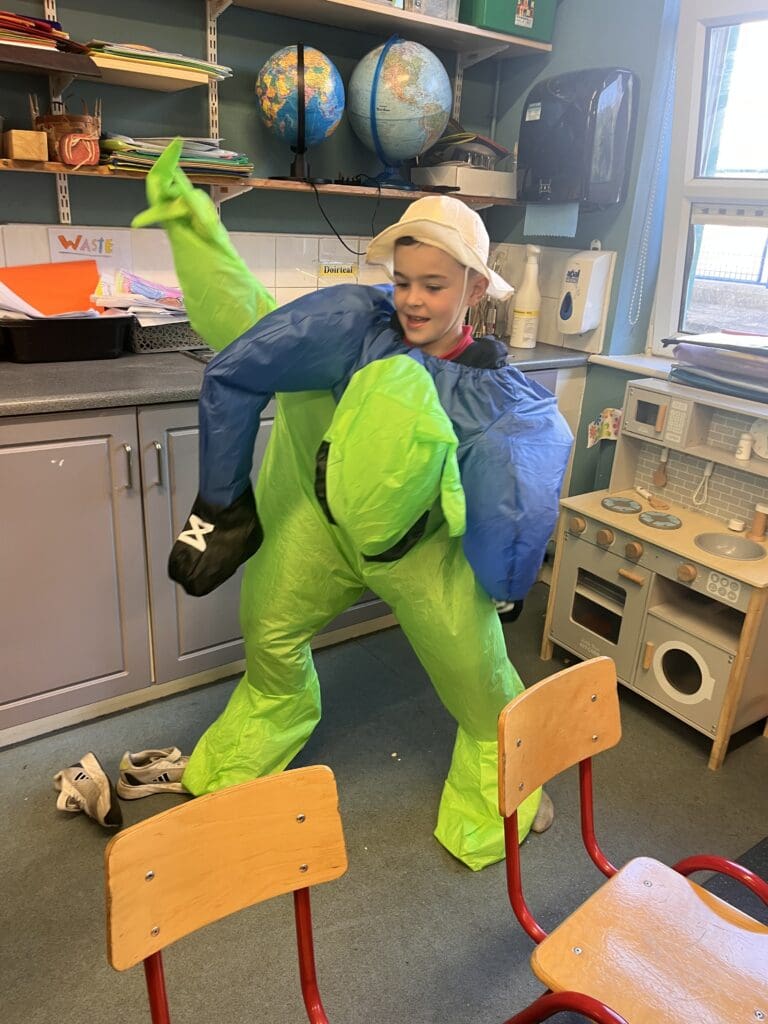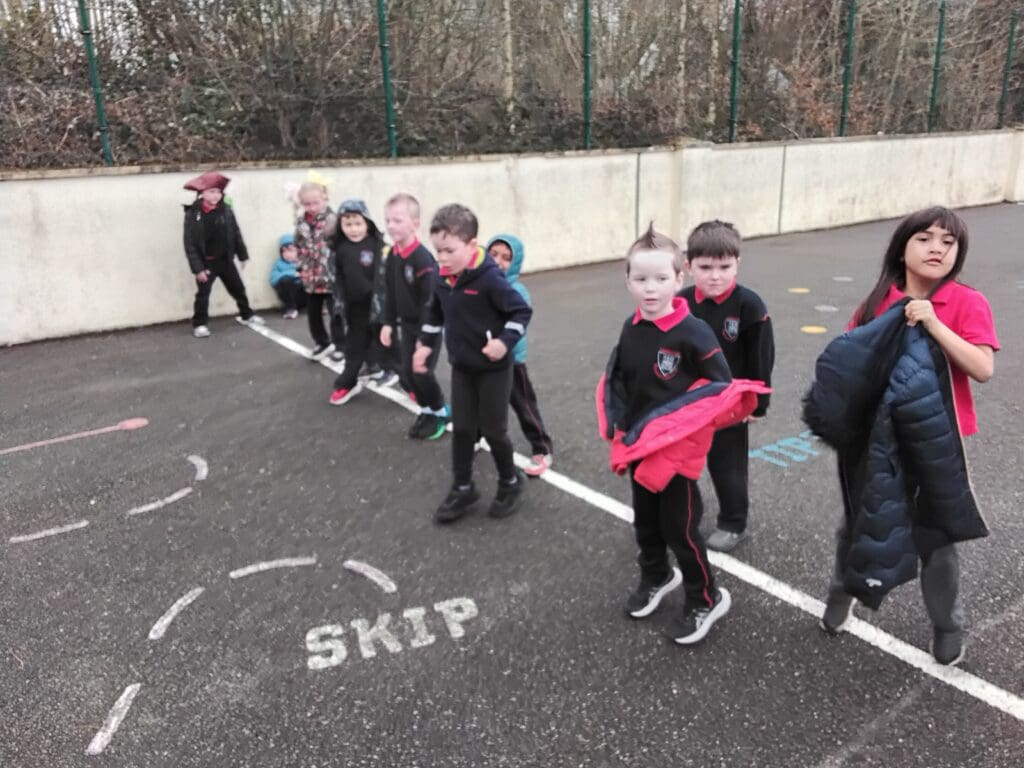 We linked up with junior infants on crazy hair day to practice our fundamental movement skills together. We pretended to be robots keeping our arms straight and knees high up when walking! Can you spot some of our crazy hair?