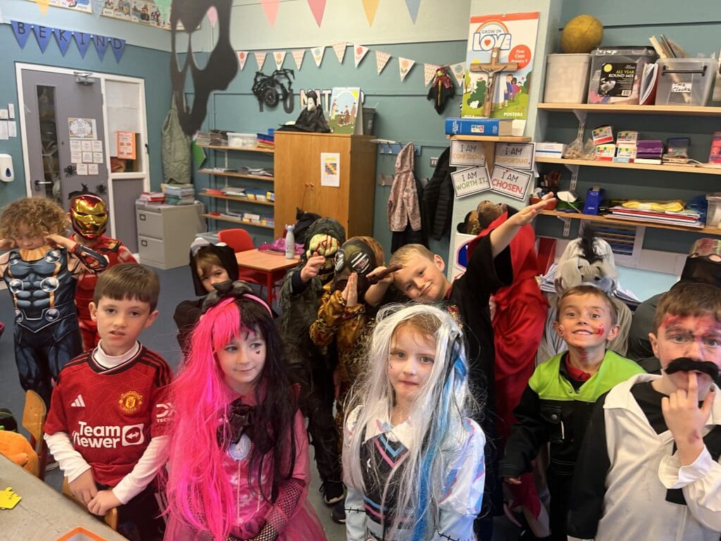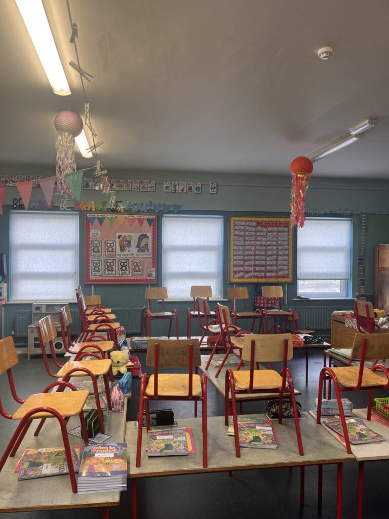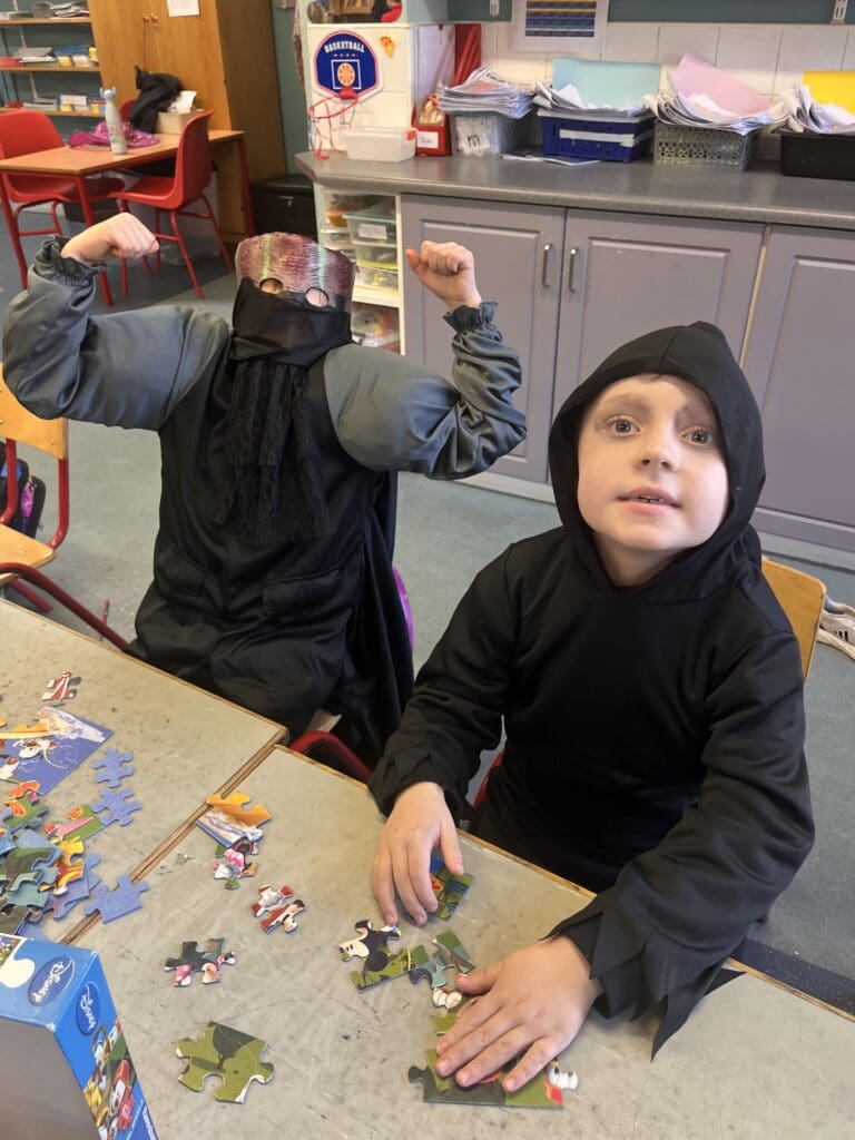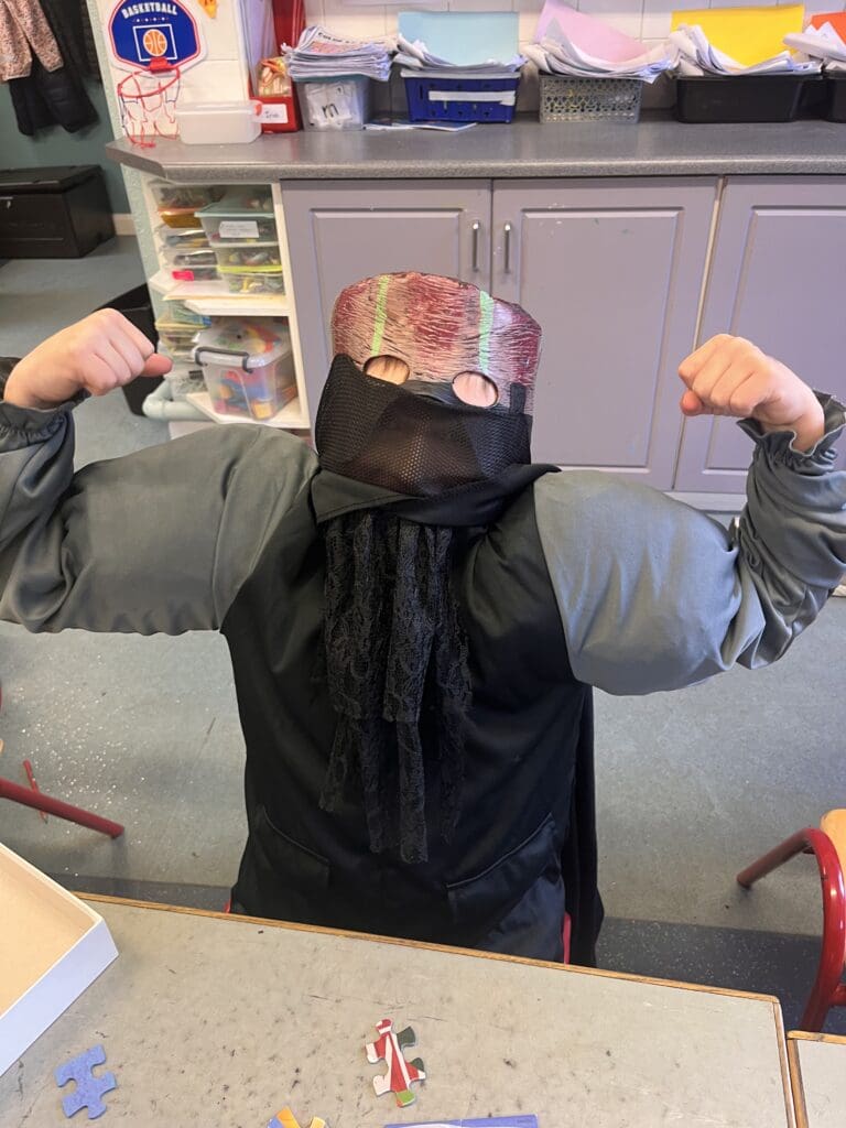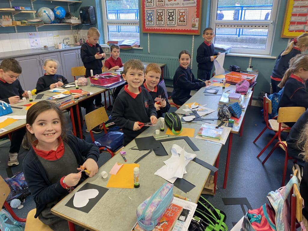 We linked up with junior infants on crazy hair day to practice our fundamental movement skills together. We pretended to be robots keeping our arms straight and knees high up when walking! Can you spot some of our crazy hair?